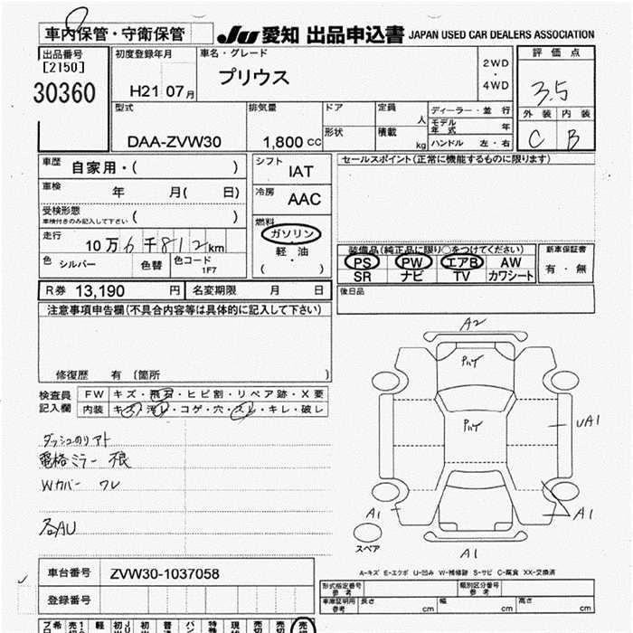 | G | DAA-ZVW30 | 2ZR-FXE | FF | CVT | 1797cc | 99ps(73kW)/5200rpm | AИ-92 | 2 450 000 | |
