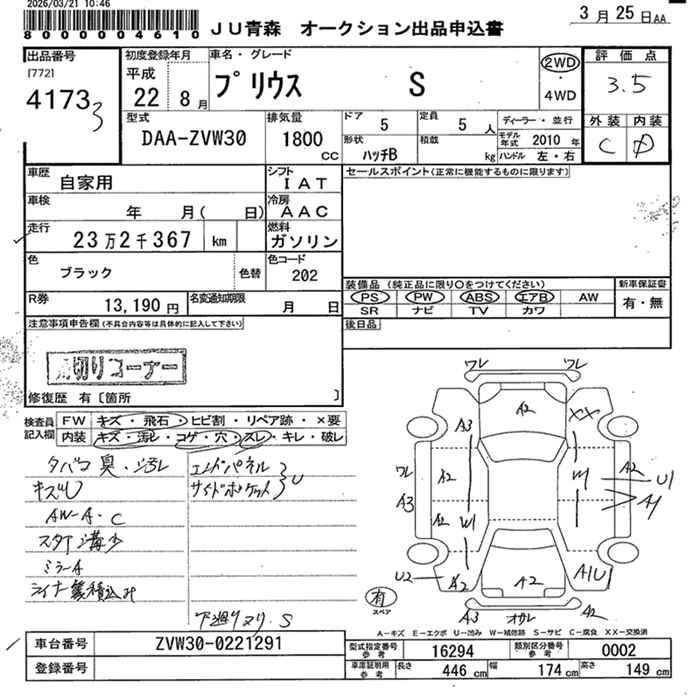 | G LED EDITION | DAA-ZVW30 | 2ZR-FXE | FF | CVT | 1797cc | 99ps(73kW)/5200rpm | AИ-92 | 2 760 000 | |