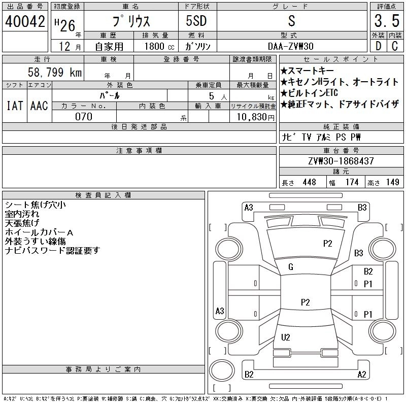 | G | DAA-ZVW30 | 2ZR-FXE | FF | CVT | 1797cc | 99ps(73kW)/5200rpm | AИ-92 | 2 592 000 | |