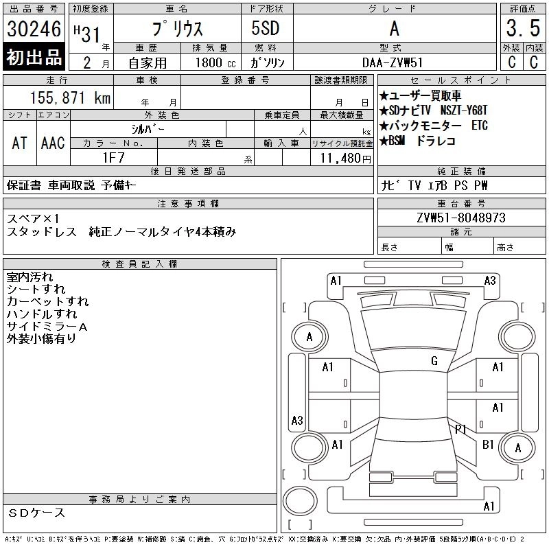 | A PREMIUM | DAA-ZVW51 | 2ZR-FXE | FF | CVT | 1797cc | 98ps(72kW)/5200rpm | AИ-92 | 3 234 000 | |