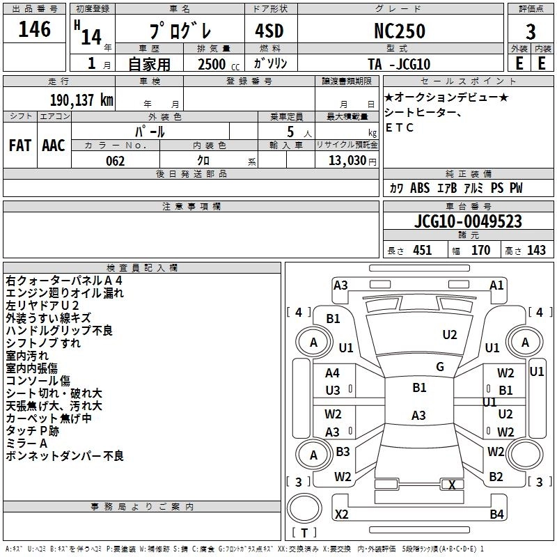 | NC250 NOBLE INTERIOR PACKAGE | TA-JCG10 | 1JZ-FSE | FR | 5AT | 2491cc | 200ps(147kW)/6000rpm | AИ-95 | 3 350 000 | |
