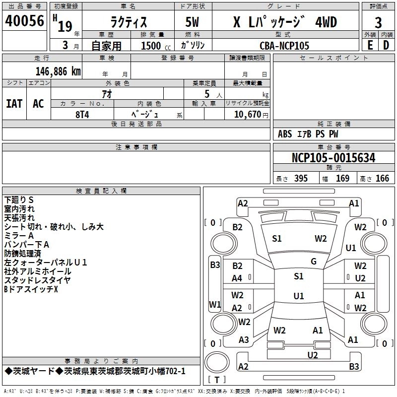 | X | CBA-NCP105 | 1NZ-FE | Full-time 4WD | 4AT | 1496cc | 105ps(77kW)/6000rpm | AИ-92 | 1 617 000 | |