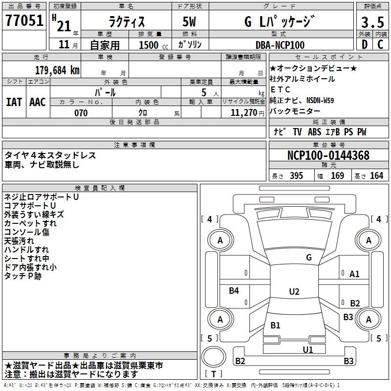 | G L PACKAGE | DBA-NCP100 | 1NZ-FE | FF | CVT | 1496cc | 110ps(81kW)/6000rpm | AИ-92 | 1 680 000 | |