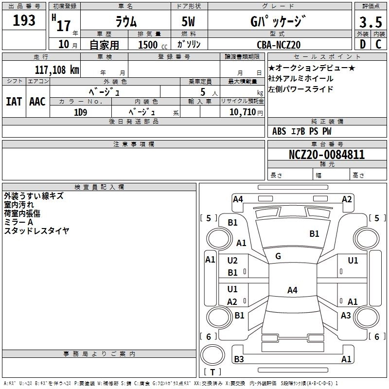 | BASEGRADE | CBA-NCZ25 | 1NZ-FE | Full-time 4WD | 4AT | 1496cc | 105ps(77kW)/6000rpm | AИ-92 | 1 656 900 | |