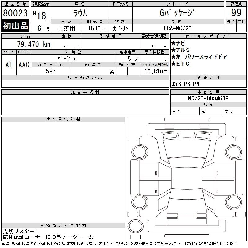 | BASEGRADE | CBA-NCZ20 | 1NZ-FE | FF | 4AT | 1496cc | 109ps(80kW)/6000rpm | AИ-92 | 1 596 000 |