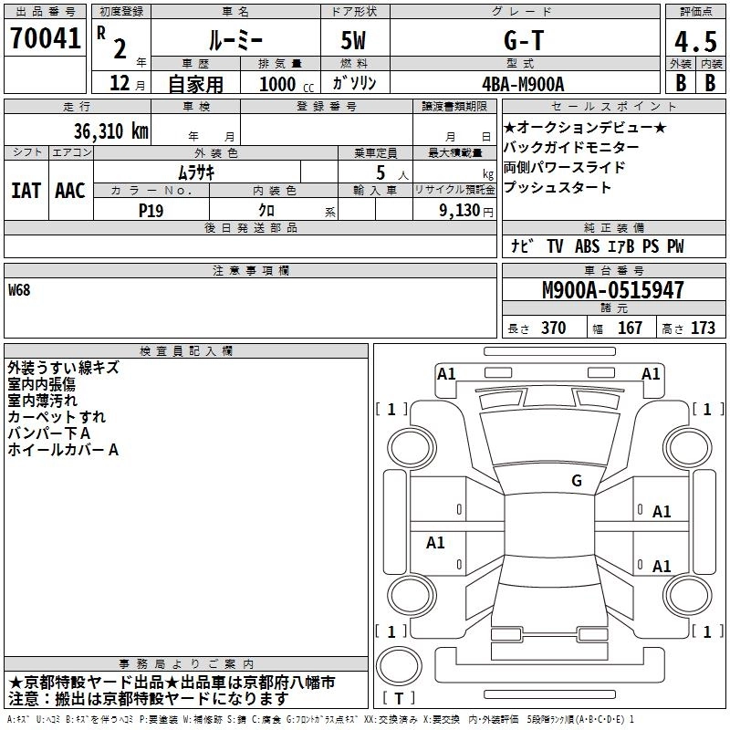 | G | 5BA-M900A | 1KR-FE | FF | CVT | 996cc | 69ps(51kW)/6000rpm | AИ-92 | 1 743 500 | |