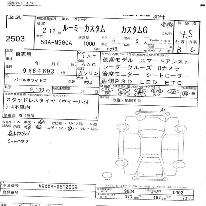 | G | 5BA-M900A | 1KR-FE | FF | CVT | 996cc | 69ps(51kW)/6000rpm | AИ-92 | 1 743 500 | |