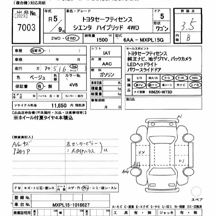 TOYOTA SIENTA 2023 г., лот № 7003