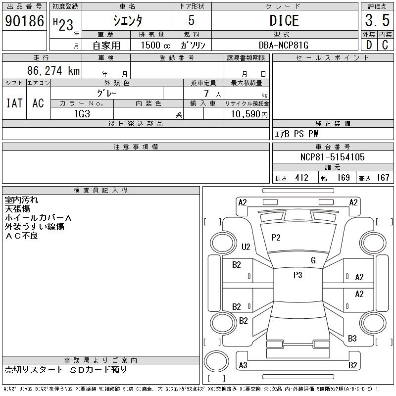 | DICE | DBA-NCP85G | 1NZ-FE | Full-time 4WD | 4AT | 1496cc | 105ps(77kW)/6000rpm | AИ-92 | 1 853 500 | |