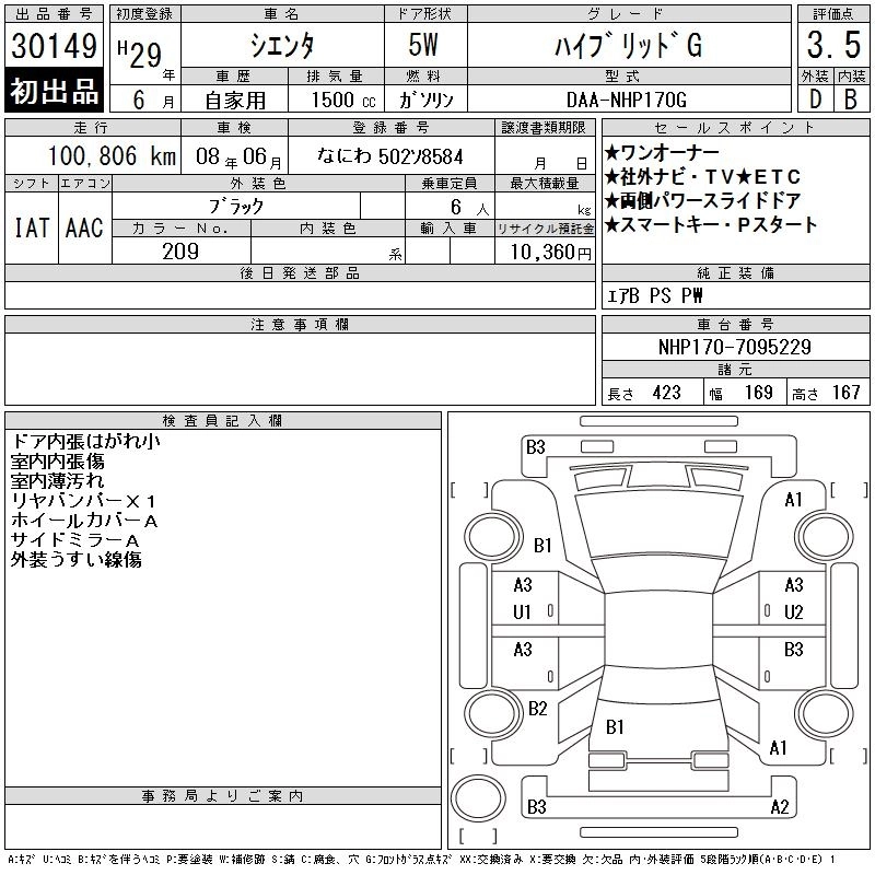 TOYOTA SIENTA 2017 г., лот № 30149