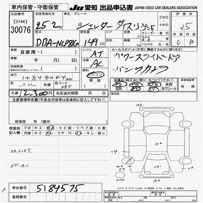 | DICE | DBA-NCP85G | 1NZ-FE | Full-time 4WD | 4AT | 1496cc | 105ps(77kW)/6000rpm | AИ-92 | 1 853 500 | |