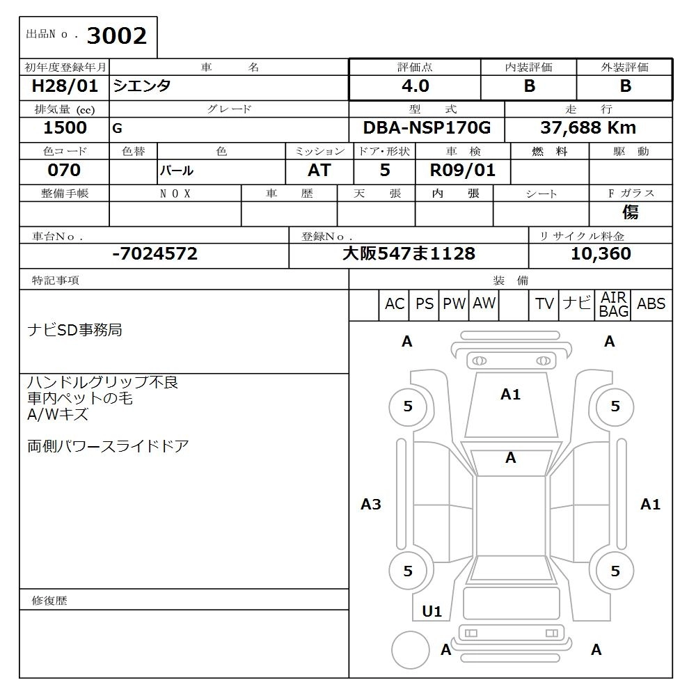 TOYOTA SIENTA 2016 г., лот № 3002