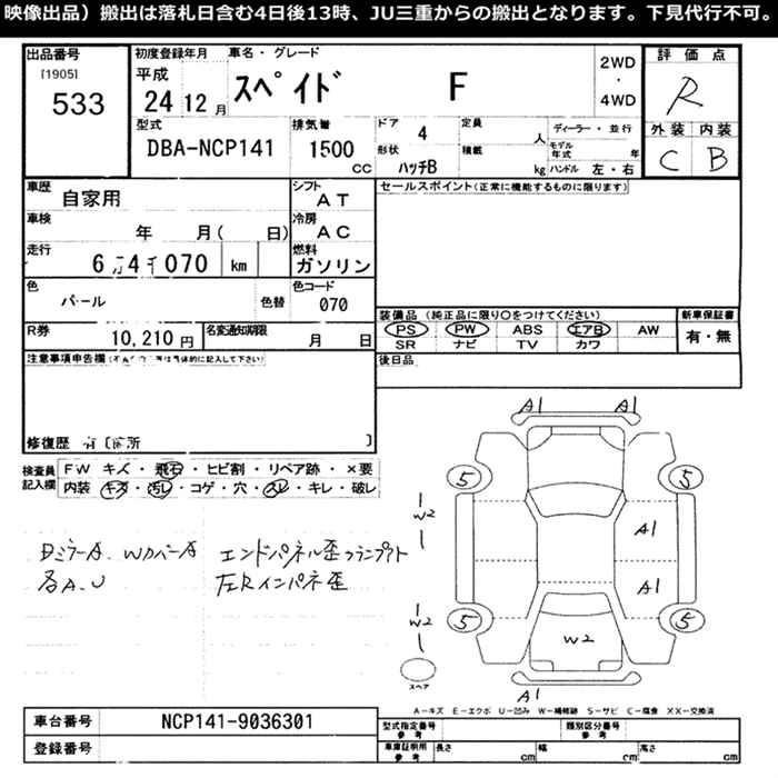 | X | DBA-NCP141 | 1NZ-FE | FF | CVT | 1496cc | 109ps(80kW)/6000rpm | AИ-92 | 1 590 000 | |