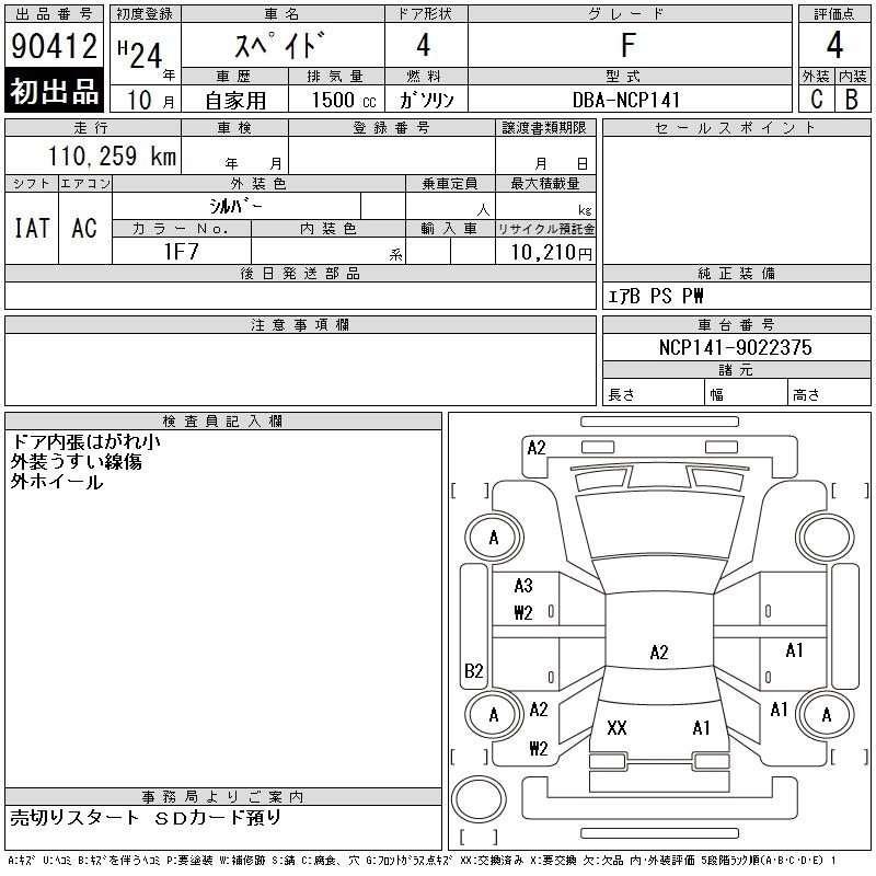 | F | DBA-NCP145 | 1NZ-FE | Full-time 4WD | CVT | 1496cc | 103ps(76kW)/6000rpm | AИ-92 | 1 810 000 | |