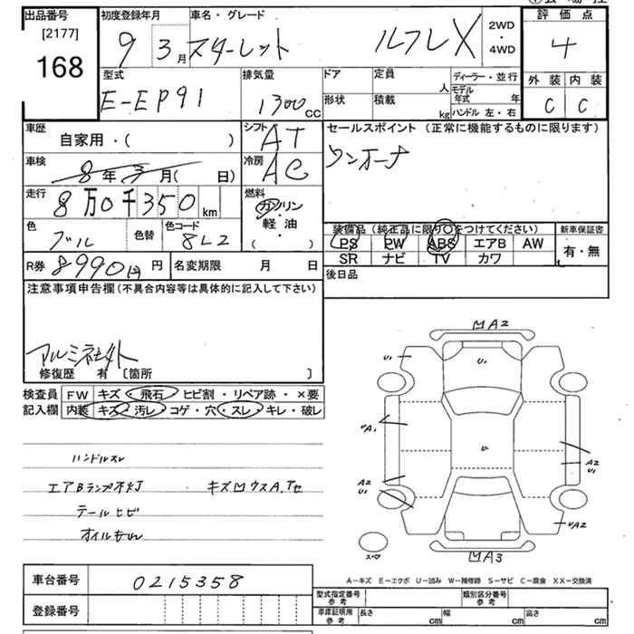 | REFLET f LIMITED | E-EP91 | 4E-FE | FF | 3AT | 1331cc | 85ps(63kW)/5500rpm | AИ-92 | 1 014 000 |