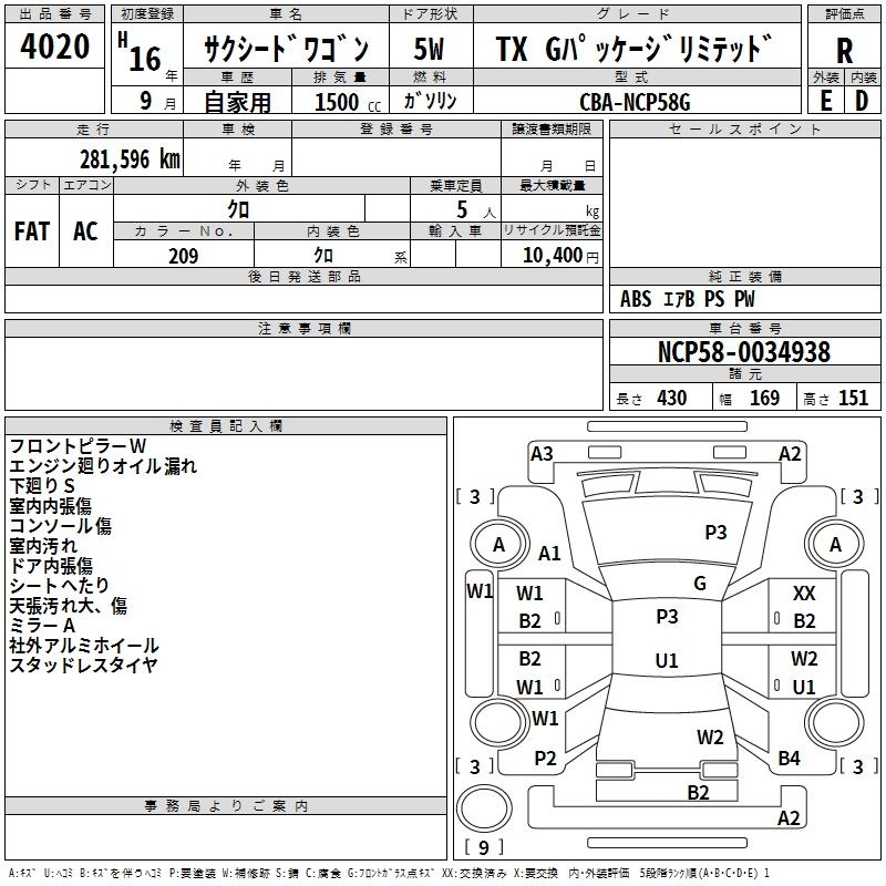 | TX G PACKAGE LIMITED | CBA-NCP58G | 1NZ-FE | FF | 4AT | 1496cc | 109ps(80kW)/6000rpm | AИ-92 | 1 585 500 | |