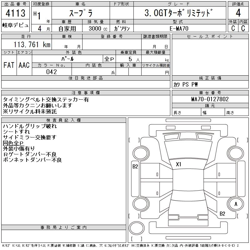 | GT TWIN TURBO WIDE BODY | E-GA70H | 1G-GTEU | FR | 4AT | 1988cc | 210ps(154kW)/6200rpm | AИ-95 | 2 723 000 | |