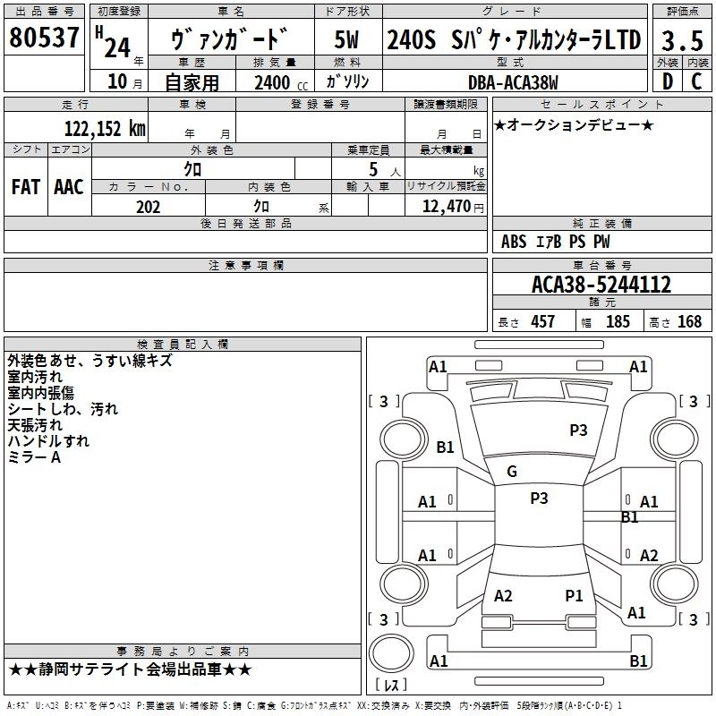 240S S PACKAGE ALCANTARA LIMITED DBA-ACA38W 2AZ-FE FF CVT 2362cc 170ps(125kW)/6000rpm AИ-92 2 713 000