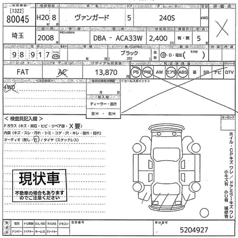 | 240S G PACKAGE | DBA-ACA33W | 2AZ-FE | Full-time 4WD | CVT | 2362cc | 170ps(125kW)/6000rpm | AИ-92 | 2 945 250 | |