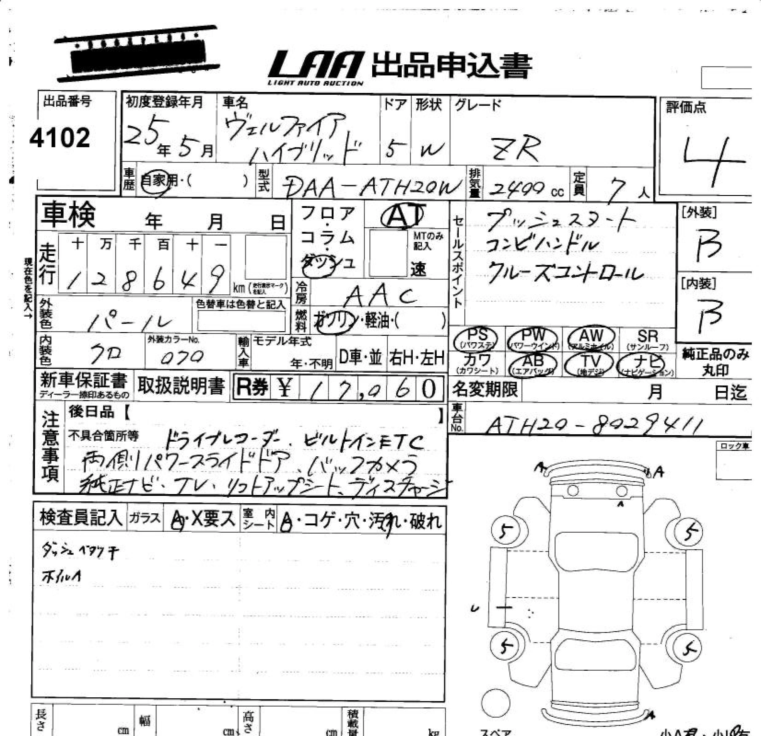 TOYOTA VELLFIRE HYBRID 2013 г., лот № 4102