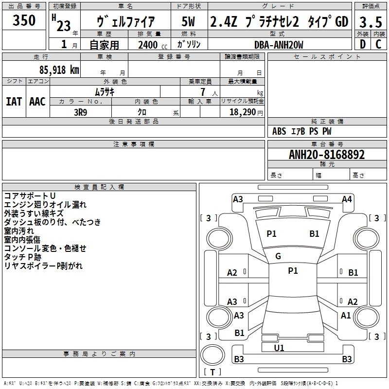 | 2.4Z PLATINUM SELECTION II TYPE GOLD II | DBA-ANH20W | 2AZ-FE | FF | CVT | 2362cc | 170ps(125kW)/6000rpm | AИ-92 | 3 560 000 |