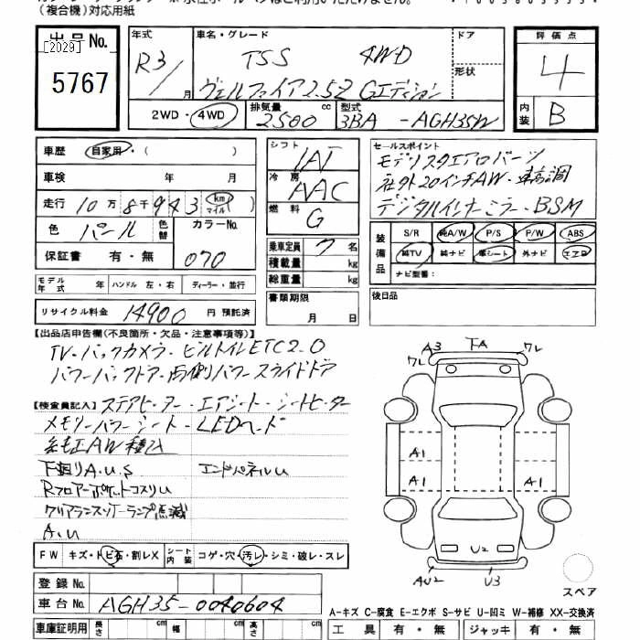 TOYOTA VELLFIRE 2021 г., лот № 5767