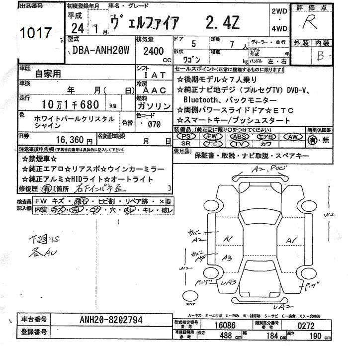 TOYOTA VELLFIRE 2012 г., лот № 1017