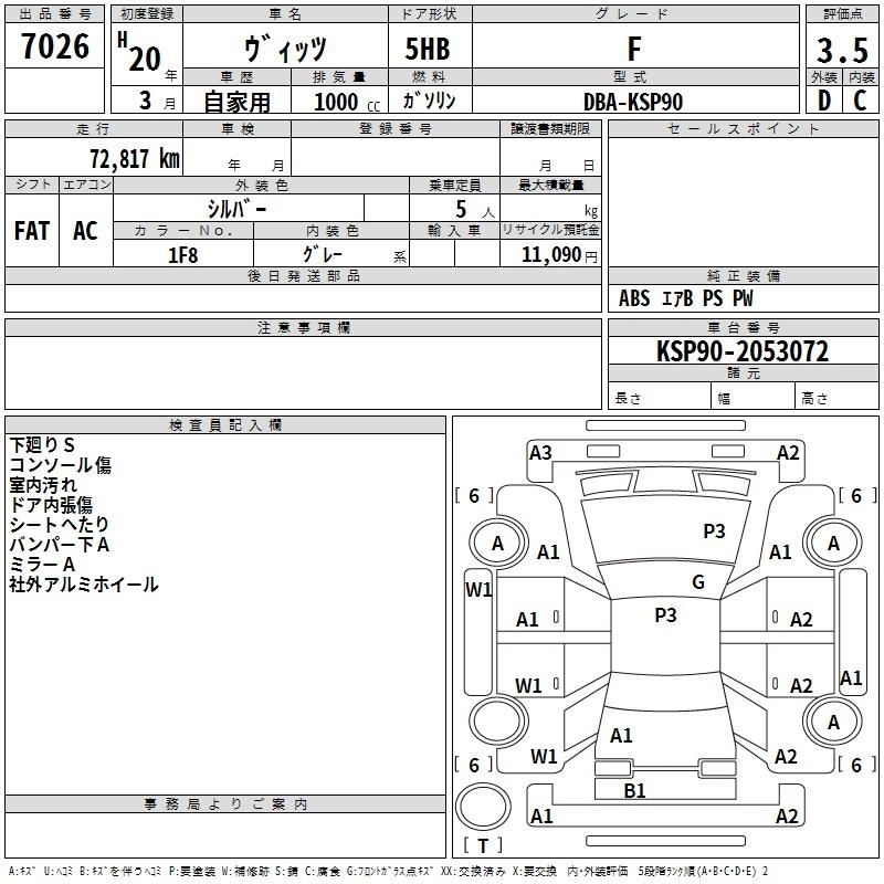| F | DBA-KSP90 | 1KR-FE | FF | CVT | 996cc | 71ps(52kW)/6000rpm | AИ-92 | 1 176 000 | |