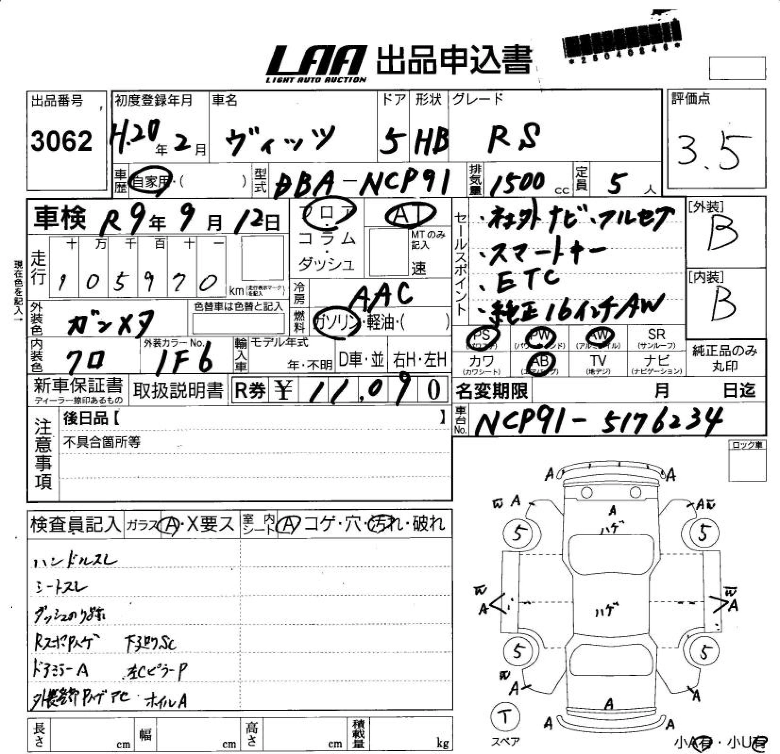 | RS | DBA-NCP91 | 1NZ-FE | FF | 5MT | 1496cc | 110ps(81kW)/6000rpm | AИ-92 | 1 627 500 | |