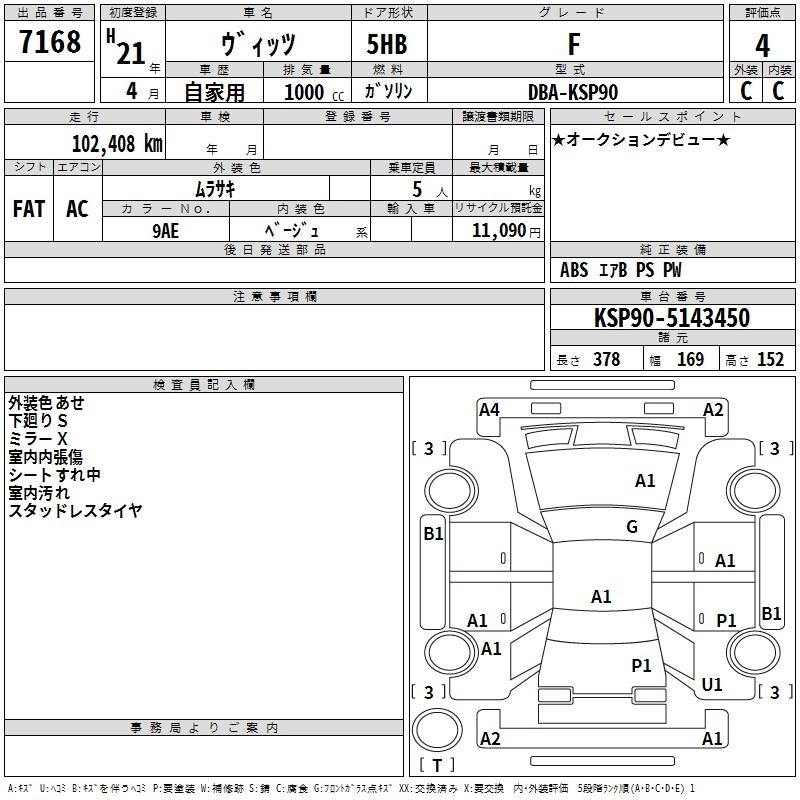 | B | DBA-KSP90 | 1KR-FE | FF | CVT | 996cc | 71ps(52kW)/6000rpm | AИ-92 | 1 076 000 |