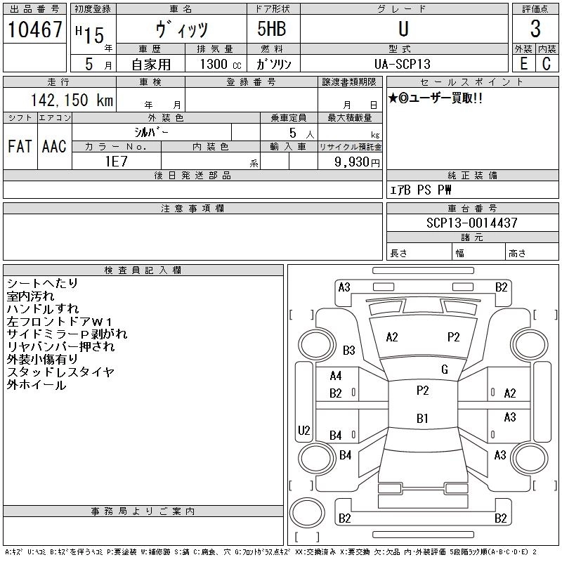 | U | UA-SCP13 | 2NZ-FE | FF | CVT | 1296cc | 87ps(64kW)/6000rpm | AИ-92 | 1 260 000 | |