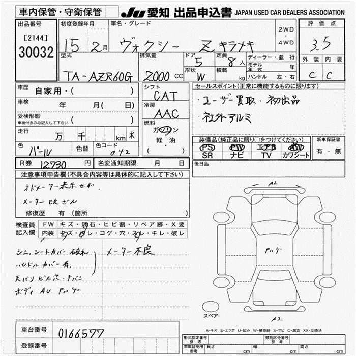 | Z KIRAMEKI II | TA-AZR60G | 1AZ-FSE(D-4) | FF | 4AT | 1998cc | 152ps(112kW)/6000rpm | AИ-92 | 2 370 000 | |