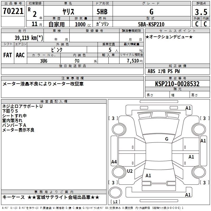 | G | 5BA-KSP210 | 1KR-FE | FF | CVT | 996cc | 69ps(51kW)/6000rpm | AИ-92 | 1 613 000 | |