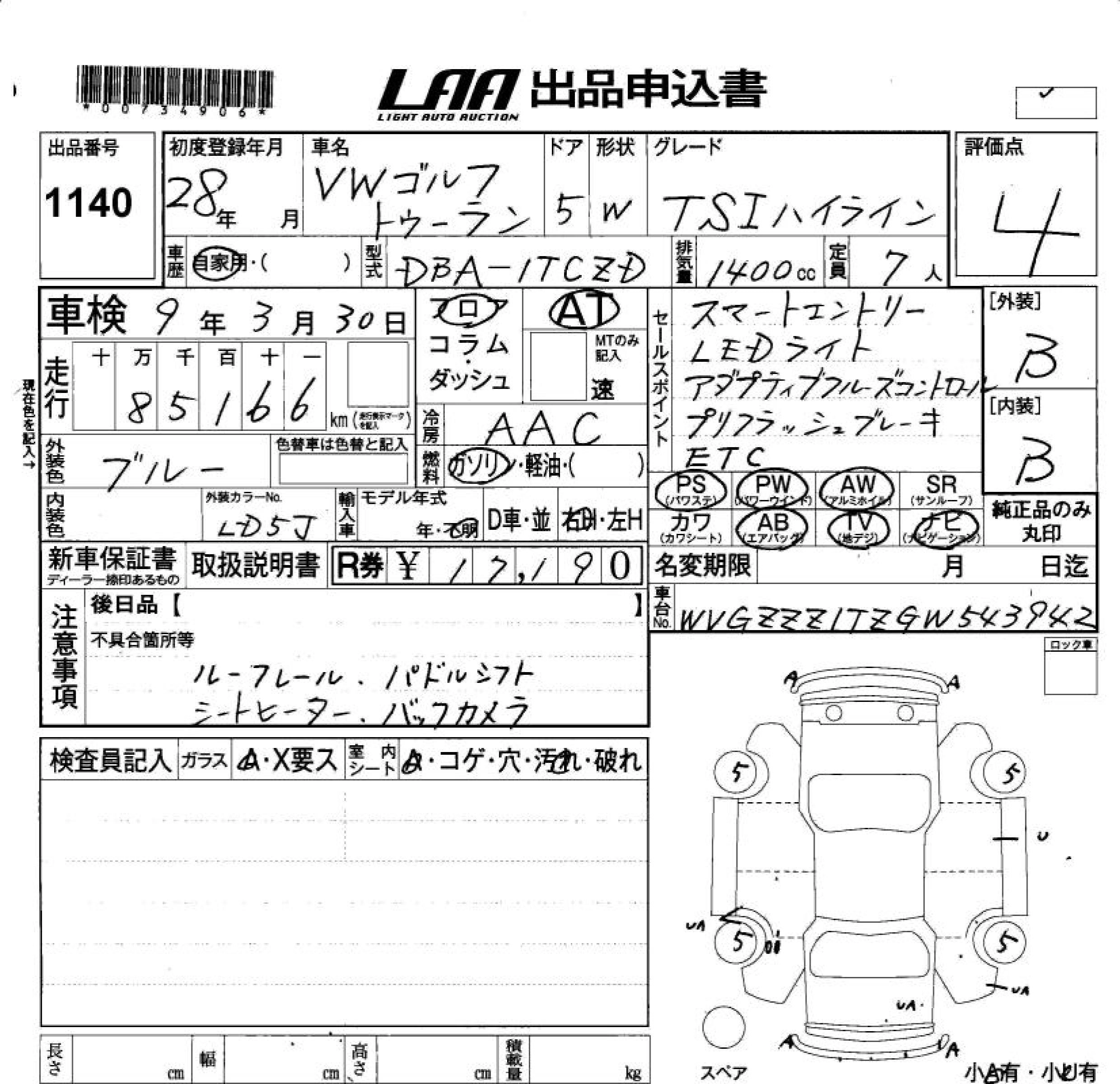 VOLKSWAGEN GOLF TOURAN 2016 г., лот № 1140