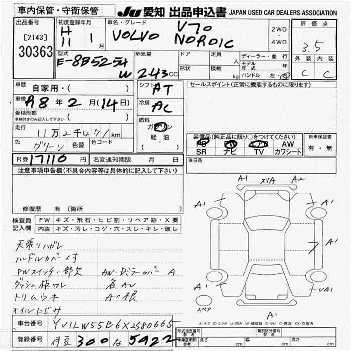 | XC AWD | GF-8B5244AWL | B5244(ターボ付) | Full-time 4WD | 4AT | 2434cc | 193ps(142kW)/5100rpm | AИ-95 | 5 900 000 | |