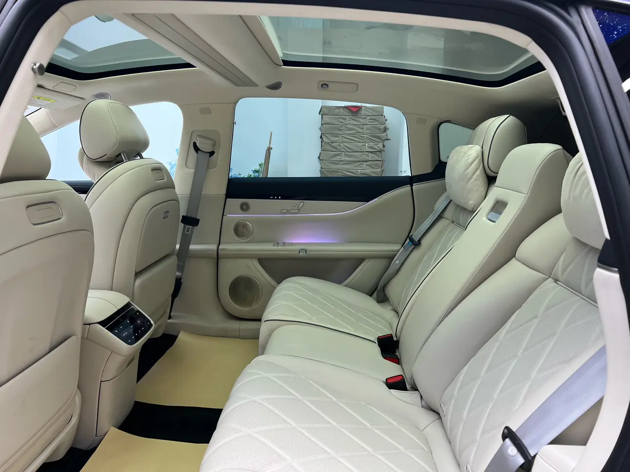 Задние сиденья оснащены системой невесомости, электрорегулировкой в 12 направлениях, электронными ремнями безопасности и небольшим столиком на правом заднем сиденье.