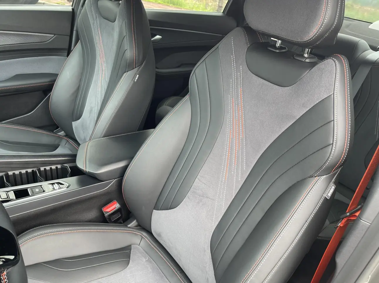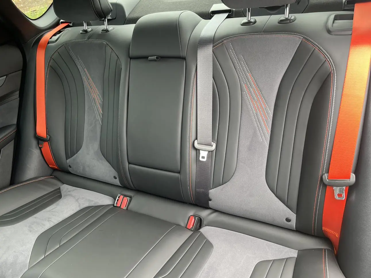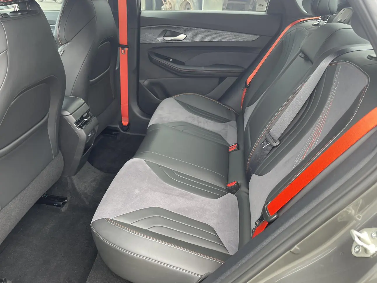 Спортивный логотип F + персонализированный логотип «95», молниеносно-оранжевый комплект, черная краска, черные ветрозащитные колеса, производительные суппорты, двойная отделка салона, напоминающая замшу (штормовой серый/ярко-зеленый), оранжевые спортивн