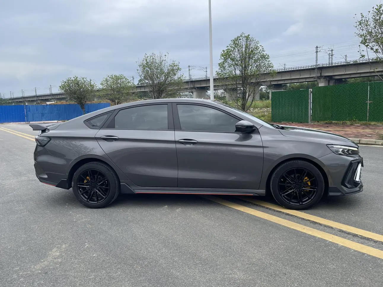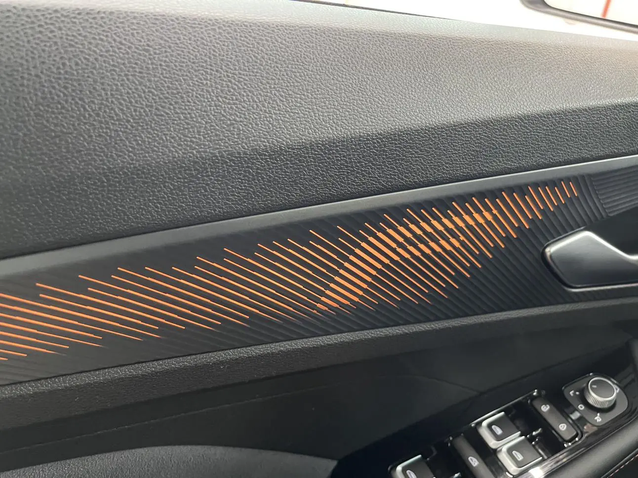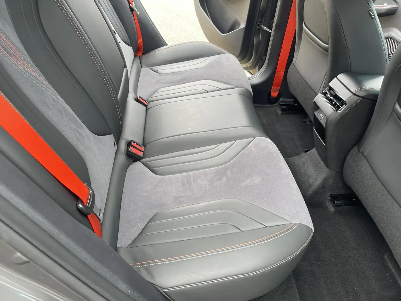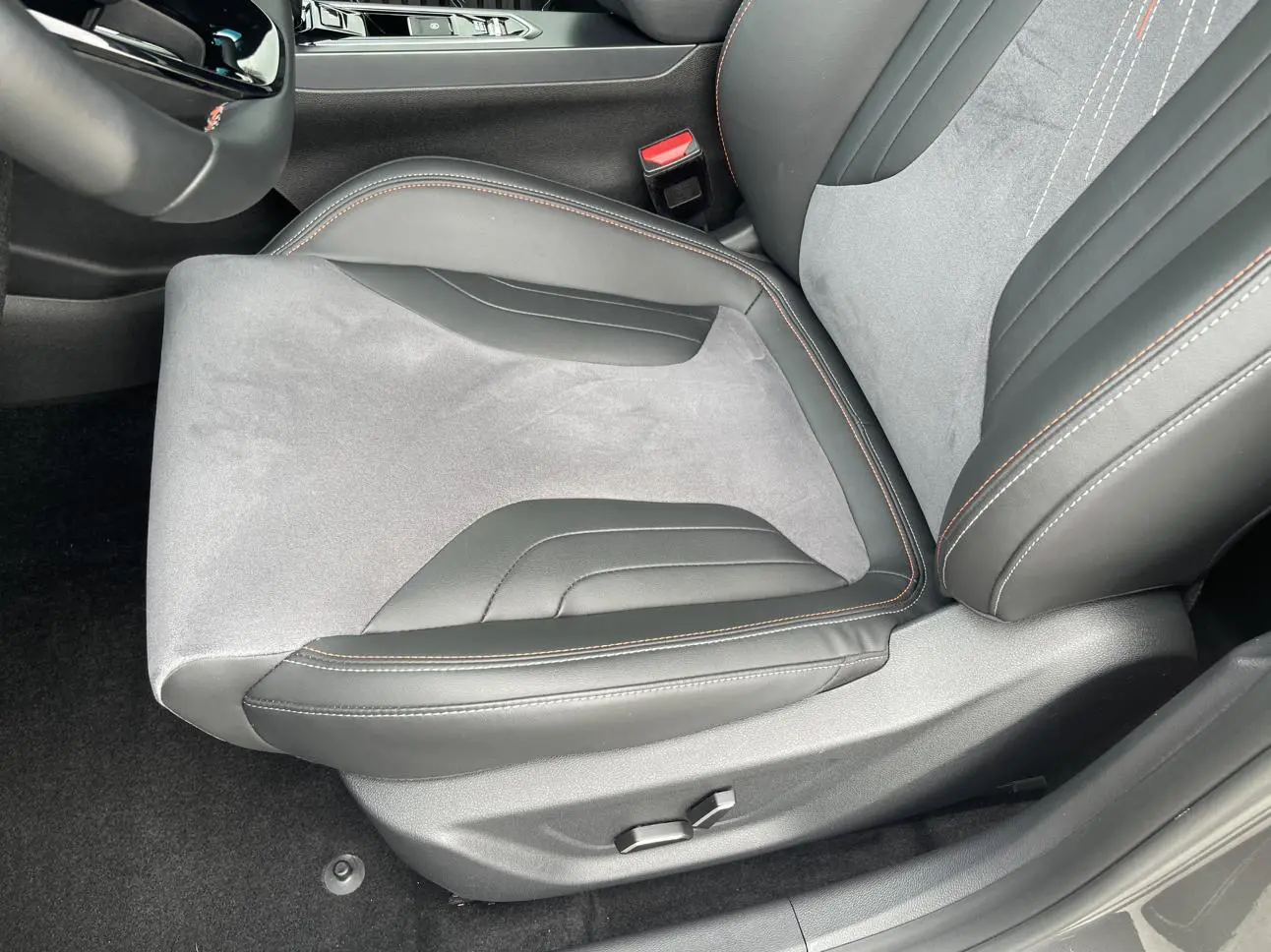 Спортивный логотип F + персонализированный логотип «95», молниеносно-оранжевый комплект, черная краска, черные ветрозащитные колеса, производительные суппорты, двойная отделка салона, напоминающая замшу (штормовой серый/ярко-зеленый), оранжевые спортивн