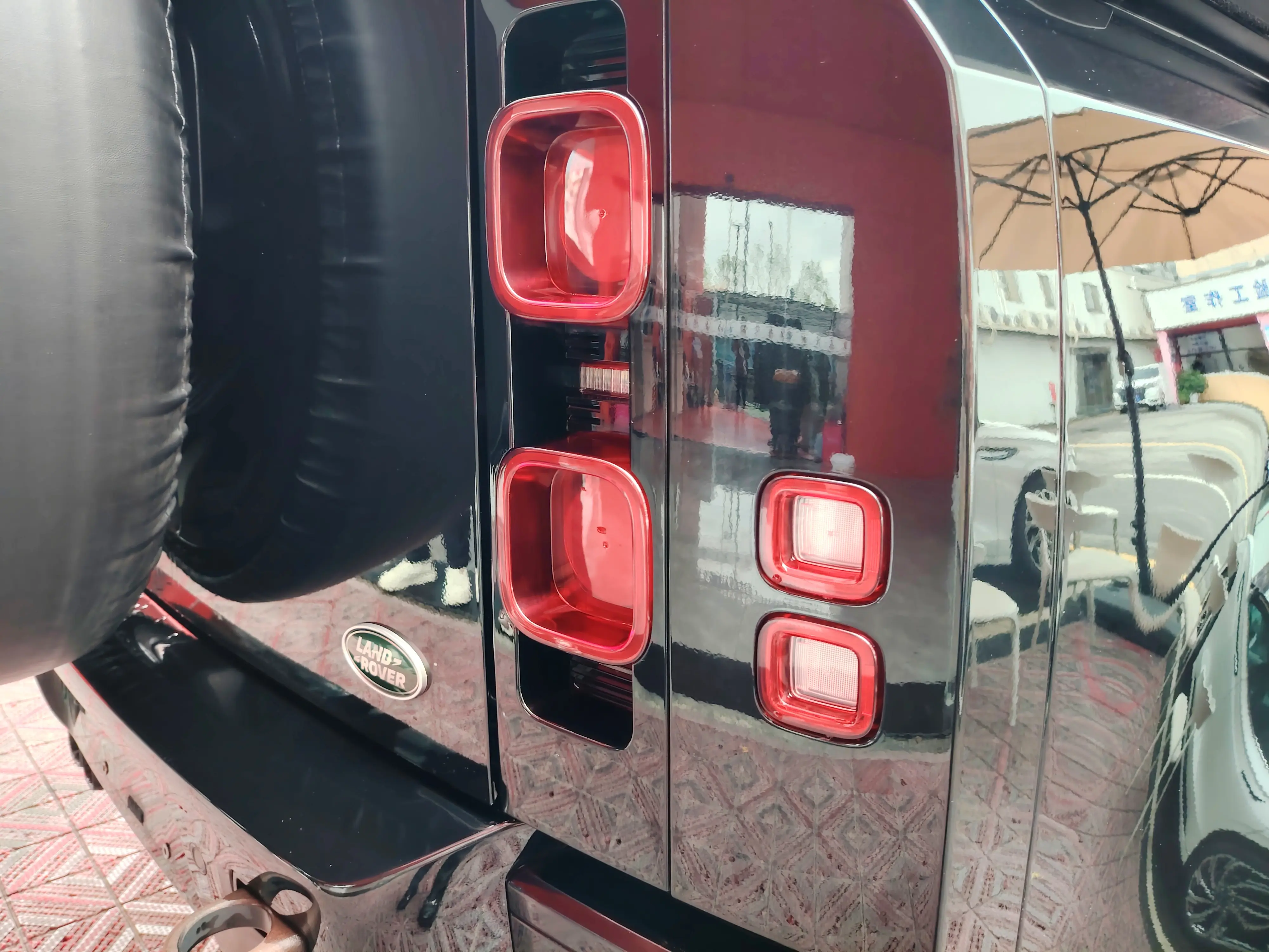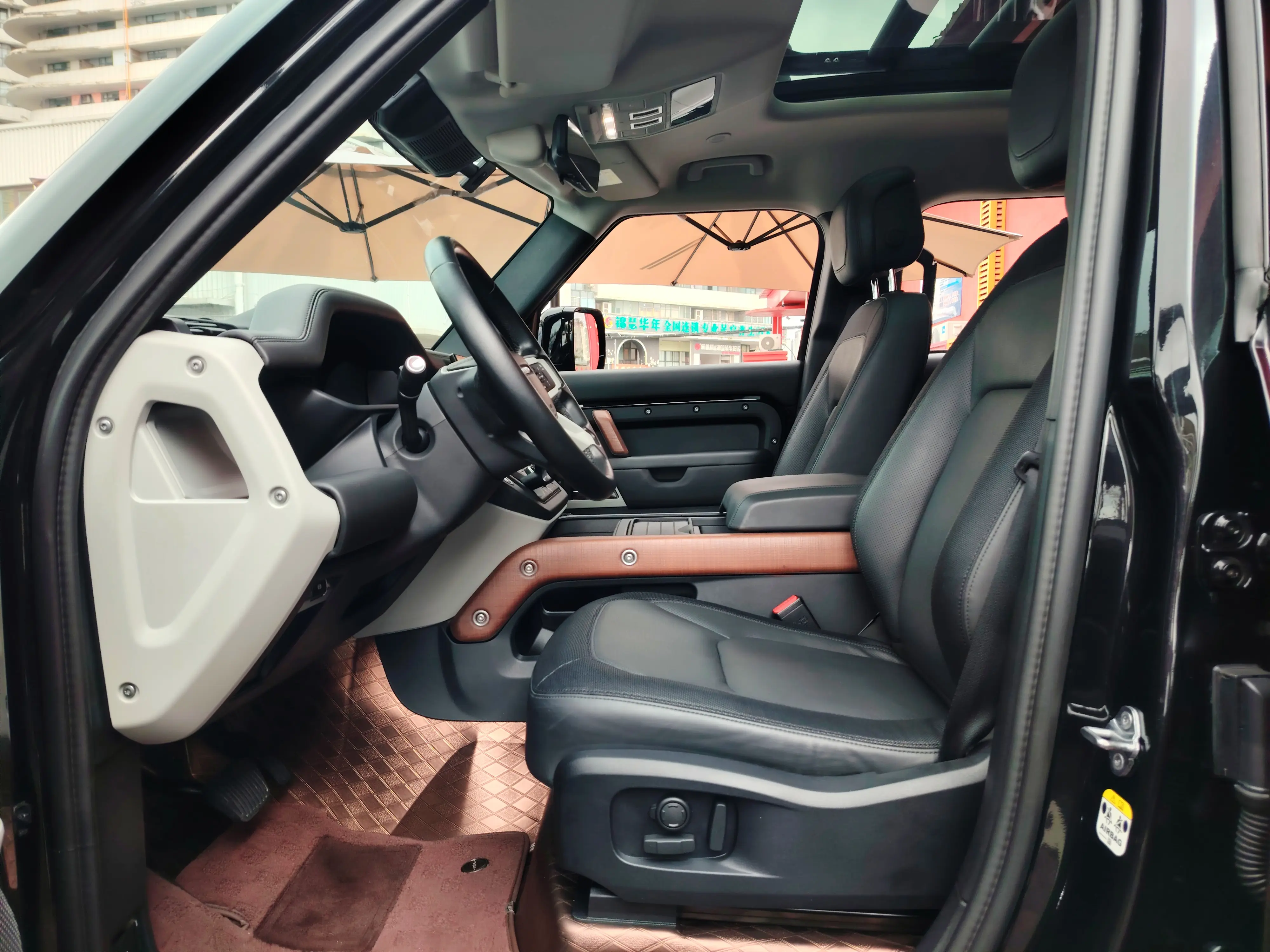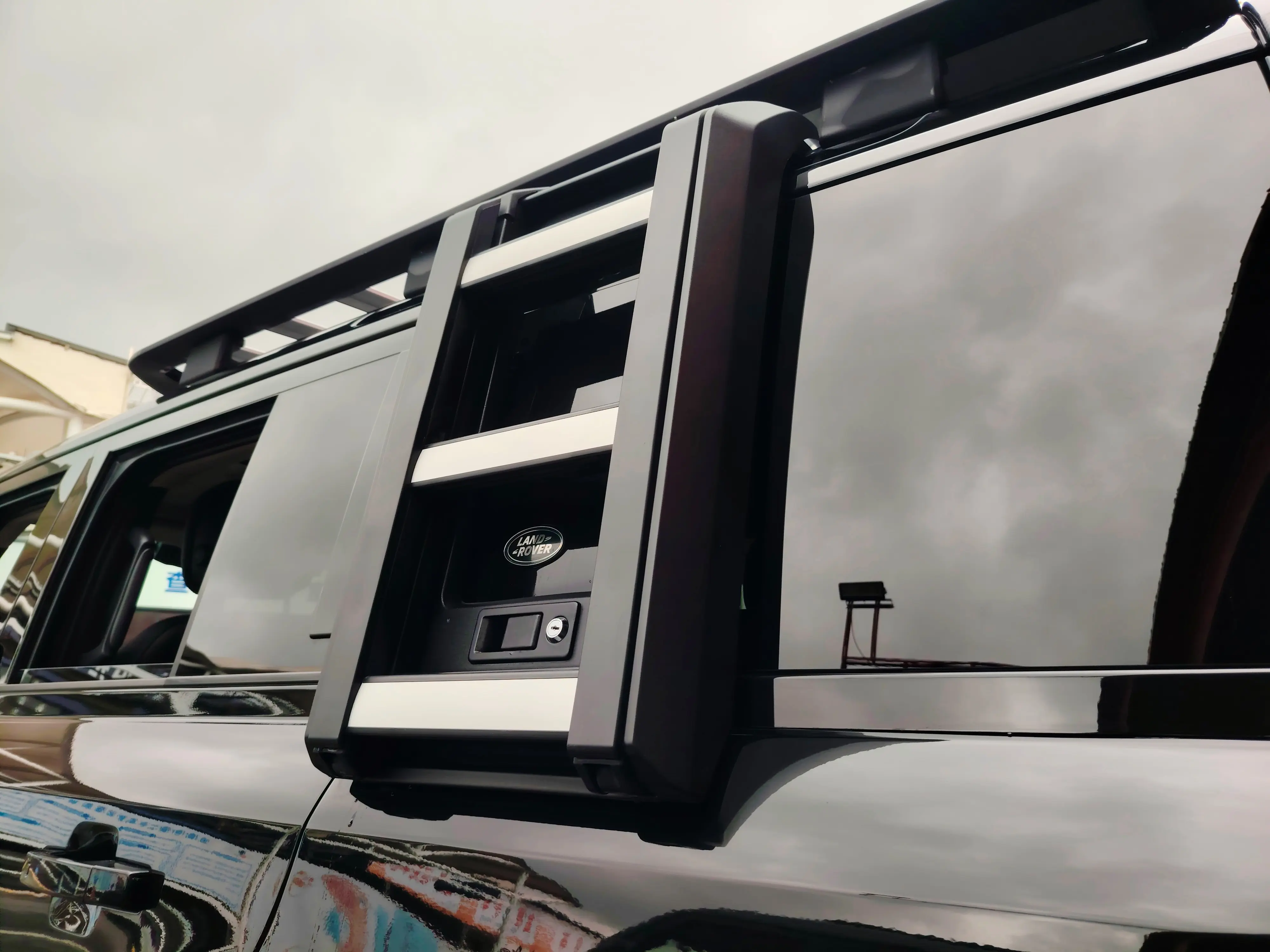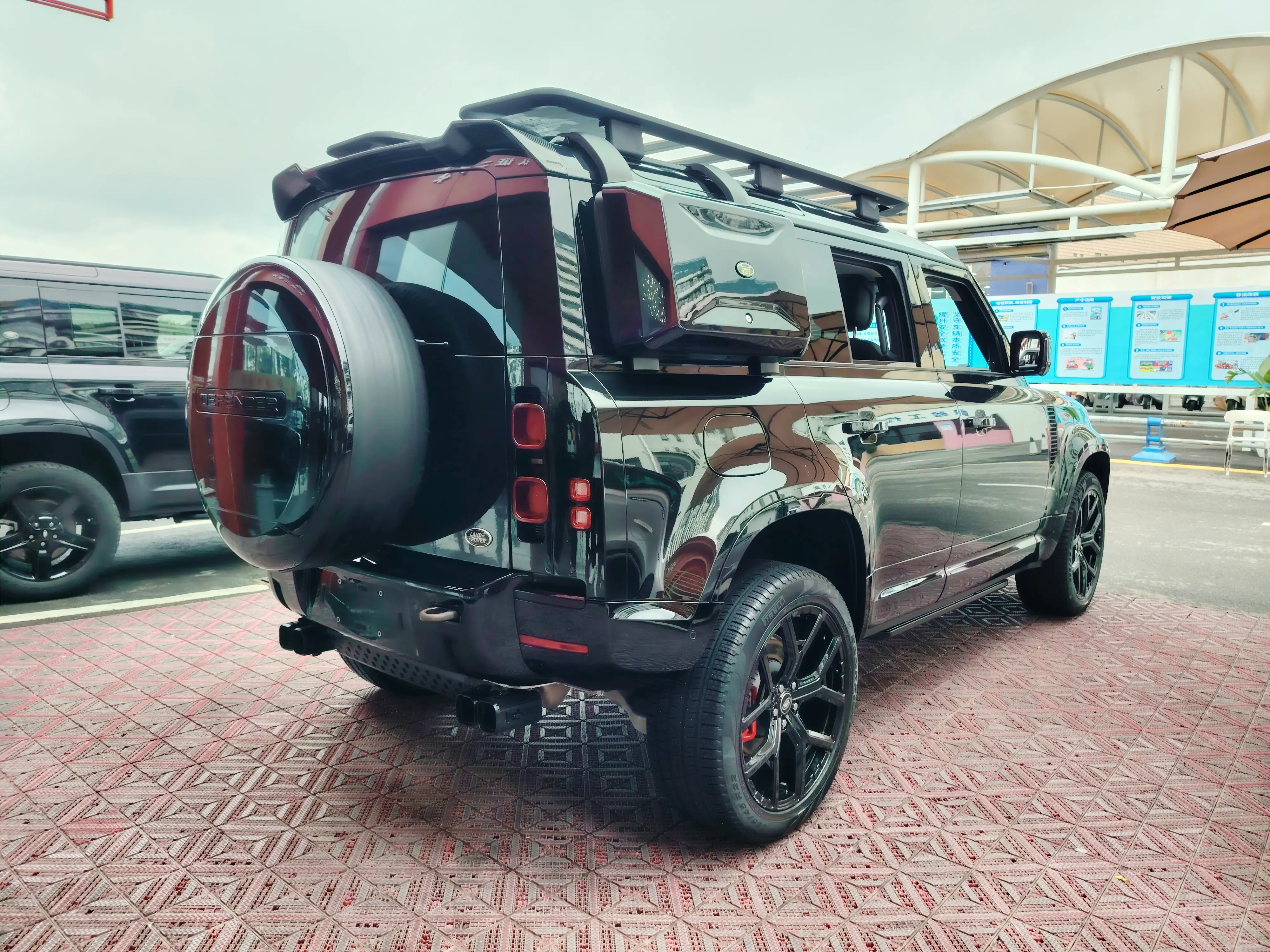 Черный багажник на крыше, внедорожные шины, бытовой разъем питания.