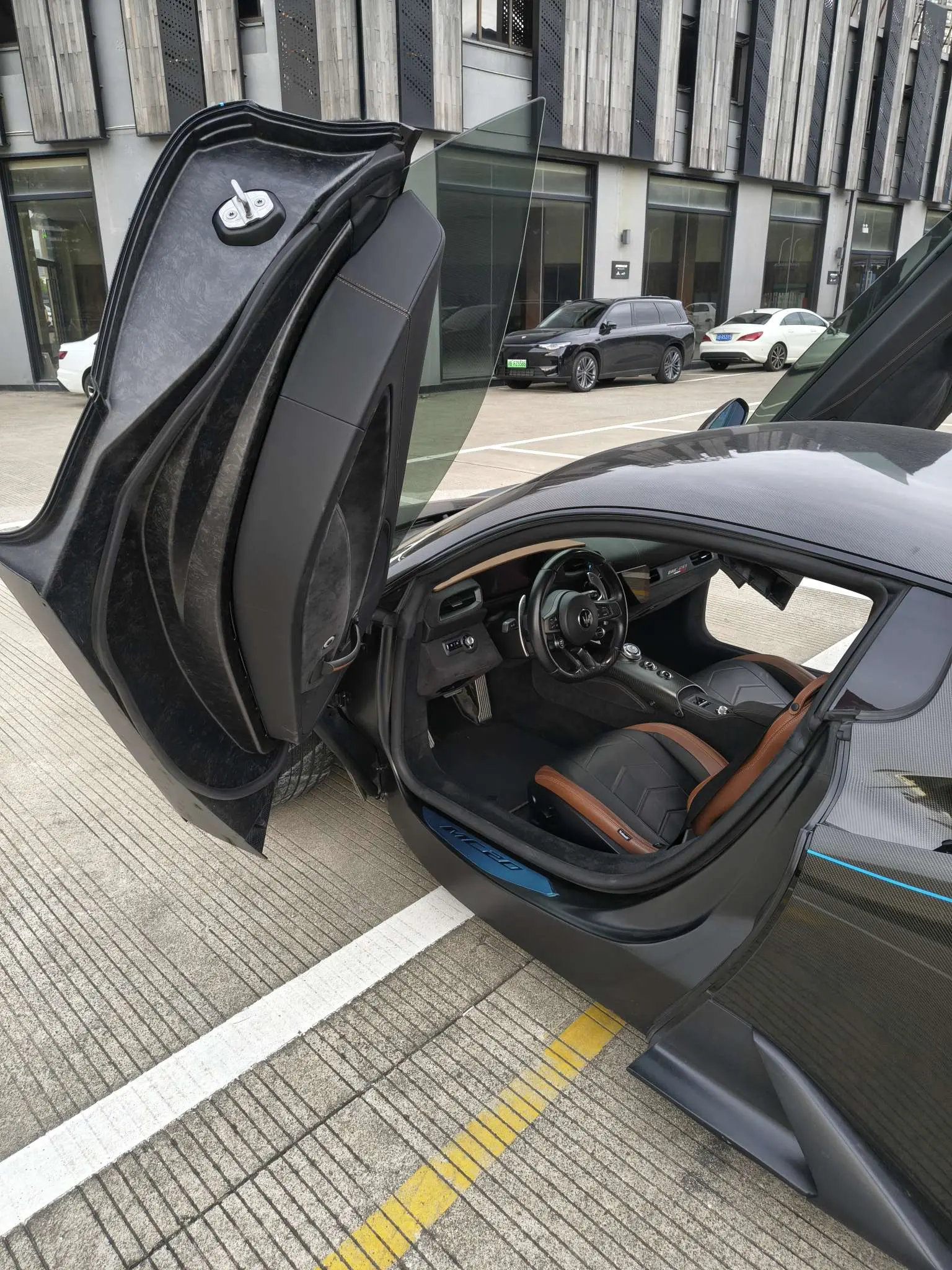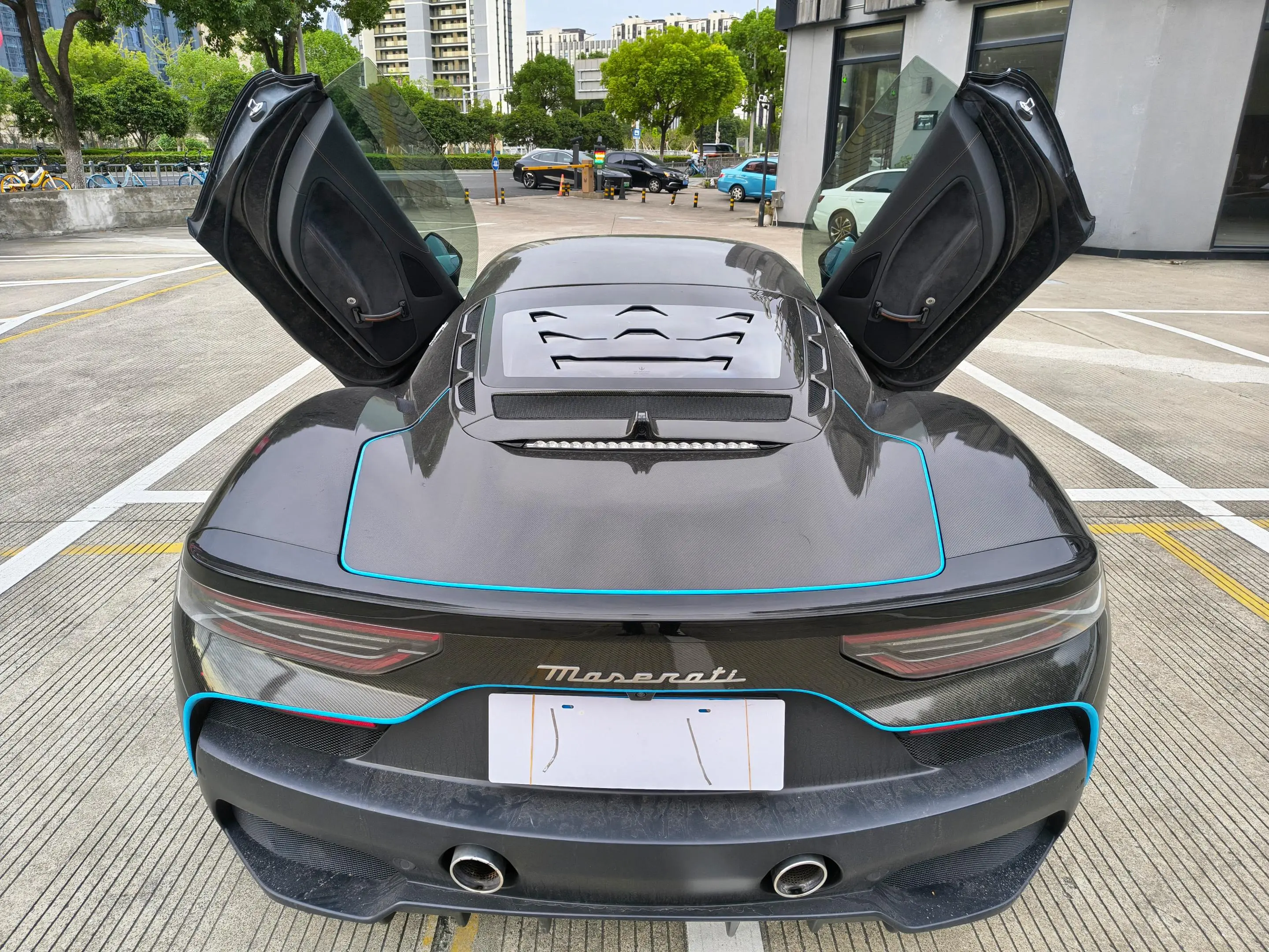 Двойные выхлопные трубы матового черного цвета, передний сплиттер из углеродного волокна, задний диффузор из углеродного волокна, вставки в области дверей и крыльев из углеродного волокна, крышка люка из углеродного волокна.