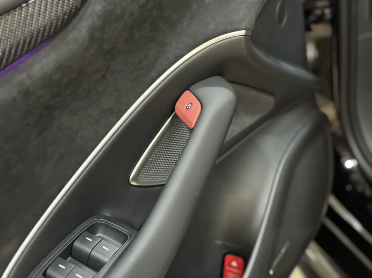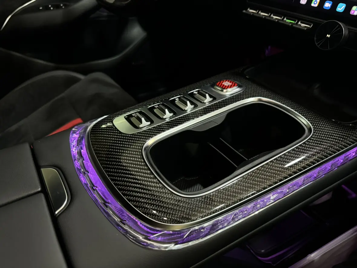 Имеются 4 накладки на дверные панели из углеродного волокна, 1 накладка на задний воздухозаборник из углеродного волокна и 2 накладки на педали из углеродного волокна.